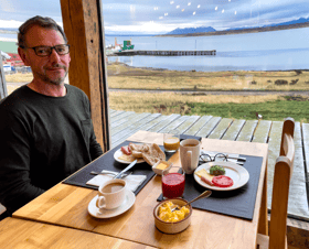Und tatsächlich ist es ein wunderbarer Flug mit einem fantastischem Blick auf die Anden. Wir landen in Puerto Montt zwischen, und haben eine super Blick auf den Villarica-Vulkan, beim Anflug auf Puerto Natales können wir El Calafate und den Perito Moreno Gletscher in Argentinien ausmachen, den wir auch noch besuchen werden. Als wir in Puerto Natales aus dem Flieger steigen, habe ich das Gefühl in Island gelandet zu sein. Mit dem Taxi fahren wir in den Ort um unser Auto abzuholen. Da Europcar noch bis 15 Uhr Mittagspause hat, essen wir in einem nahen Cafe eine Kleinigkeit und können dann unkompliziert unseren SUV in Empfang nehmen. Wir fahren knapp 50m bis uns die Polizei anhält. Aha, in Puerto Natales giebt es ein komplexex Einbahn-System welches anstatt mit international anerkannten Schildern mit gemalten Pfeilen auf Holzschildern markiert ist. Wir wenden schleunigst und kennen nun das System. Wir fahren noch etwas kreuz und quer durch den Ort und beschliessen dann im Hotel einzuchecken. Zu unserer grossen Begeisterung sind wir in diesem fantastischen Hotel die einzigen Gäste und bekommen das schönste Zimmer, ein Eckzimmer mit wahnsinns Blick auf den Fjord. Wir beschliessen spontan, hier zu beleiben und Puerto Natales bei unser Rückkehr zu besichtigen. Wir geniessen es unglaublich, einen Nachmittag zu plegern, die herrliche Aussicht inkl. Sonnenuntergang zu geniessen und dann ein herrliches Nachtessen serviert zu bekommen. Wir fühlen uns wie Könige.